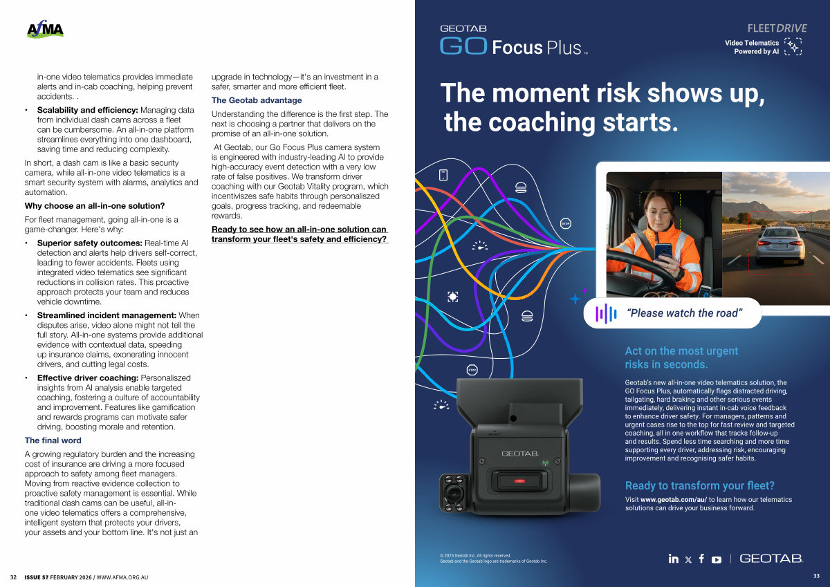 A growing regulatory burden and the increasing cost of insurance are driving a more focused approach to safety among fleet managers. Moving from reactive evidence collection to proactive safety management is essential. While traditional dash cams can be useful, all-inone video telematics offers a comprehensive, intelligent system that protects your drivers, your assets and your bottom line. It ' s not just an upgrade in technology— it ' s an investment in a safer, smarter and more efficient fleet.