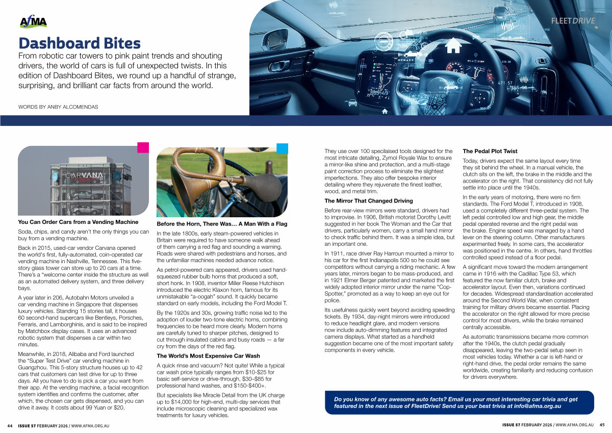 Do you know of any awesome auto facts? Email us your most interesting car trivia and get featured in the next issue of FleetDrive! Send us your best trivia at info @ afma. org. au