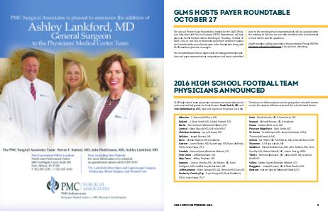 GLMS high school team physicians volunteer to conduct physicials and cover football games for health issues. Mark Smith, MD, and Tom Steltenkamp, ATC, lead and organize this group each fall.