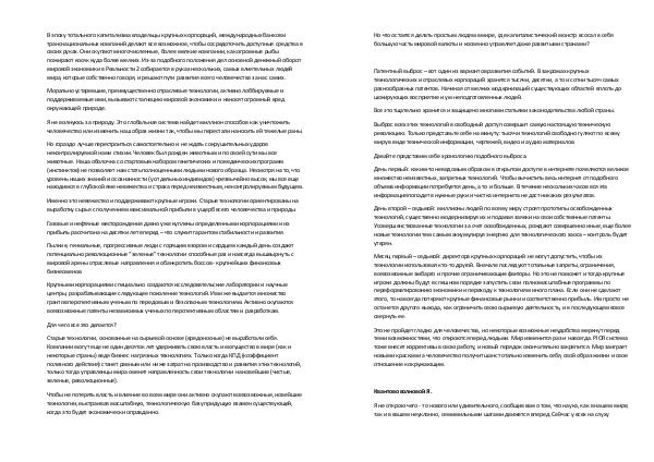Выброс всех этих технологий в свободный доступ совершит самую настоящую техническую революцию. Только представьте себе на минуту: тысячи технологий свободно гуляют по всему миру в виде технической информации, чертежей, видео и аудио материалов.