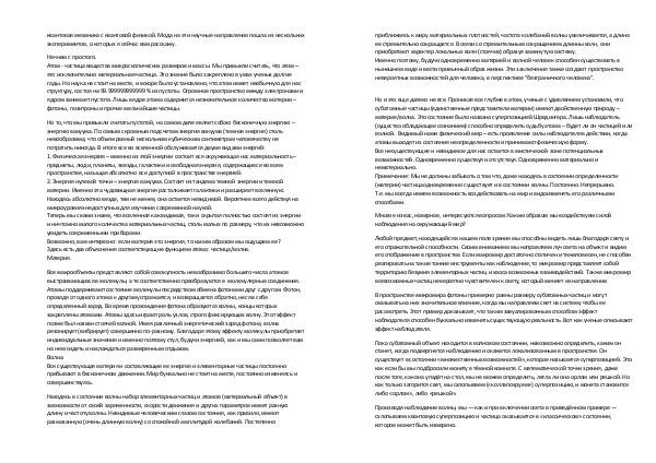 Но то, что мы привыкли считать пустотой, на самом деле являет собою бесконечную энергию – энергию вакуума. По самым скромным подсчетам энергия вакуума( темная энергия) столь невообразима, что объем равный нескольким кубическим сантиметрам человечеству не потратить никогда. В итоге все во вселенной обслуживается двумя видами энергий: 1. Физическая энергия – именно из этой энергии состоит вся окружающая нас материальность – предметы, люди, планеты, звезды, галактики и свободная энергия, содержащиеся во всем пространстве, насыщая абсолютно все доступной в пространстве энергией. 2. Энергия нулевой точки – энергия вакуума. Состоит из тандема темной энергии и темной материи. Именно эта чудовищная энергия расталкивает галактики и расширяет вселенную. Находясь абсолютно везде, тем не менее, она остается невидимой. Вероятнее всего действуя на микроуровнях недоступных для изучения современной наукой. Теперь мы с вами знаем, что вселенная как видимая, так и скрытая полностью состоят из энергии и ничтожно малого количества материальных частиц, столь малых по размеру, что их невозможно увидеть современными приборами. Возможно, вам интересно: если материя это энергия, то каким образом мы ощущаем ее? Здесь есть два объяснения соответствующие функциям атома: частица / волна. Материя.