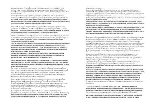 Голографический принцип гласит: физические законы в комнате, где вы сейчас сидите, полностью описываются законами, существующими на стенах этой комнаты( то есть в двумерном мире). А законы, которые работают на стенах комнаты, описываются законами, работающими в одномерном пространстве – на прямой. Согласно теории Малдасены( ученого открывшего теорию) гравитация во Вселенной генерируется тонкими вибрирующими струнами. Эти струны являются голограммами событий, которые происходят в более простом плоском космосе. По сути, этот принцип утверждает, что данные, содержащие описание объема пространства, как например, человека или кометы, спрятаны в области плоской " настоящей " версии Вселенной. В черной дыре, например все объекты, которые туда попадают, заключены в колебаниях поверхности. Это означает, что объекты сохраняются практически как воспоминание или фрагменты данных, а не как физический объект, который существует.