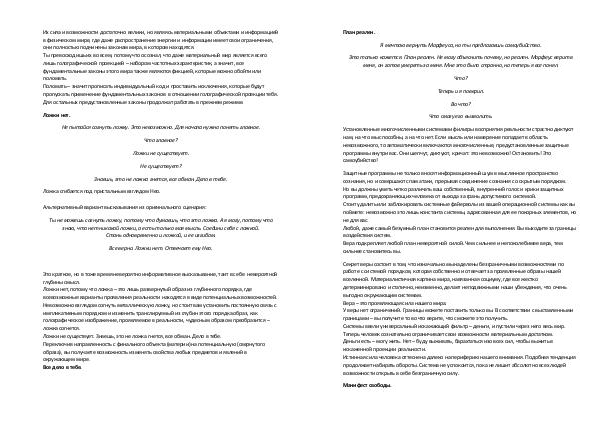 Ложки нет. Не пытайся согнуть ложку. Это невозможно. Для начала нужно понять главное. Что главное? Ложки не существует. Не существует?