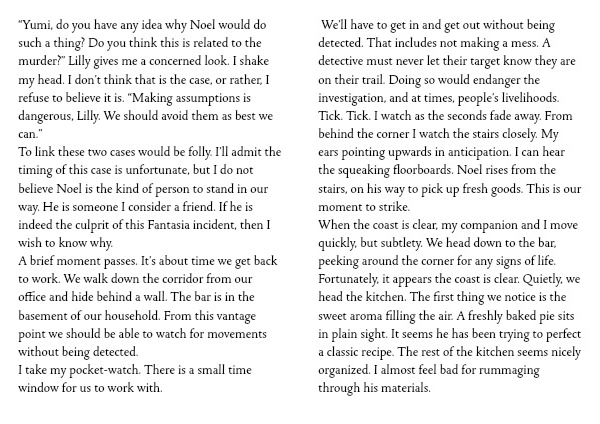“Yumi, do you have any idea why Noel would do such a thing? Do you think this is related to the murder?” Lilly gives me a concerned look. I shake my head. I don't think that is the case, or rather, I refuse to believe it is. “Making assumptions is dangerous, Lilly. We should avoid them as best we can.”