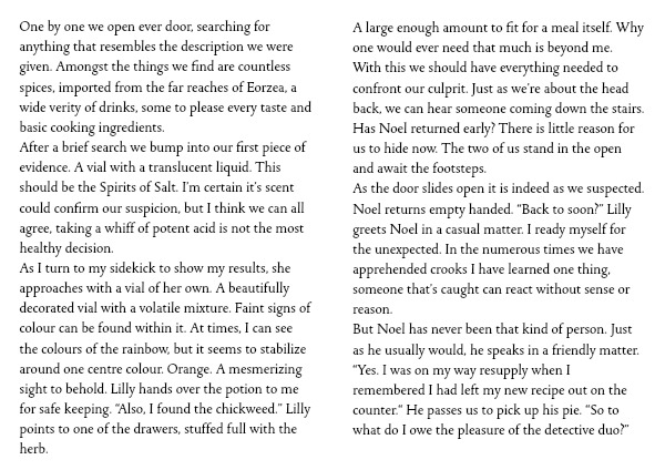 But Noel has never been that kind of person. Just as he usually would, he speaks in a friendly matter. “Yes. I was on my way resupply when I remembered I had left my new recipe out on the counter.“ He passes us to pick up his pie. “So to what do I owe the pleasure of the detective duo?”