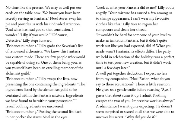 No time like the present. We may as well put our cards on the table now. “We know you have been secretly serving us Fantasia.” Noel stores away his pie and provides us with his undivided attention. “And what has lead you to that conclusion, I wonder.” “Lilly, if you would.” “Of course, Detective.” Lilly steps forward.