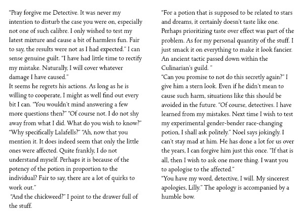 “Pray forgive me Detective. It was never my intention to disturb the case you were on, especially not one of such calibre. I only wished to test my latest mixture and cause a bit of harmless fun. Fair to say, the results were not as I had expected.” I can sense genuine guilt. “I have had little time to rectify my mistake. Naturally, I will cover whatever damage I have caused.”