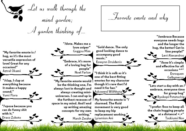 “My favorite emote would be the thinking one, I'm always lost in thought and always creating mini-universes. I can end up in the furthest recesses of space in my mind. And I end up writing amazing concepts for my own writing.”