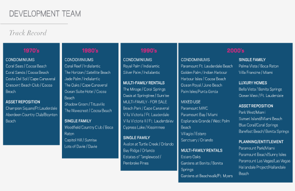 LUXURY HOMES Bella Vista / Bonita Springs Ocean View / Ft. LauderdaleASSET REPOSITION Park West / Miami Sunset Island / Miami Beach Blue Coral / Coral Springs Barefoot Beach / Bonita SpringsPLANNING / ENTITLEMENT Paramount Park / Miami Paramount Beach / Sunny Isles Paramount Las Vegas / Las Vegas Hallandale Project / Hallandale Beach |