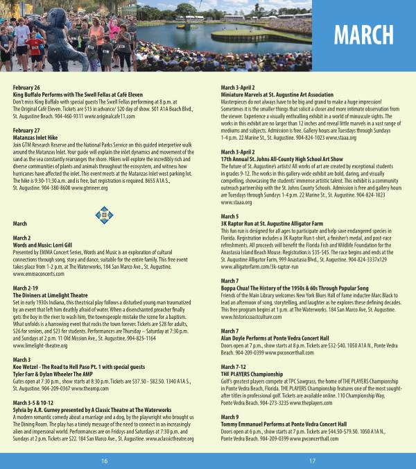 March 2-19 The Diviners at Limelight Theatre Set in early 1930s Indiana , this theatrical play follows a disturbed young man traumatized by an event that left him deathly afraid of water . When a disenchanted preacher finally gets the boy in the river to wash him , the townspeople mistake the scene for a baptism . What unfolds is a harrowing event that rocks the town forever . Tickets are $ 28 for adults , $ 26 for seniors , and $ 23 for students . Performances are Thursday – Saturday at 7:30 p . m . and Sundays at 2 p . m . 11 Old Mission Ave ., St . Augustine . 904-825-1164 www . limelight-theatre . org