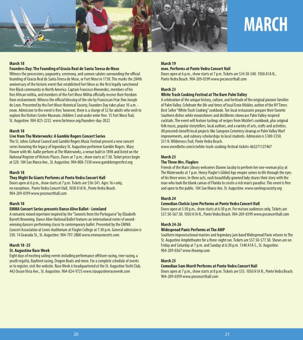 March 18 -25 St . Augustine Race Week Eight days of exciting sailing events including performance offshore racing , river racing , a youth regatta , Bayfront racing , Dragon Boats and more . For a complete schedule of events or to register , visit the website . Race Week is headquartered at the St . Augustine Yacht Club , 442 Ocean Vista Ave ., St . Augustine . 904-824-9725 www . staugustineraceweek . com