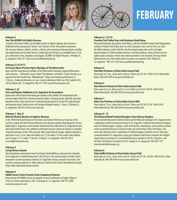 February 4 Living History Saunter Join living history interpreters from the Historic Florida Militia as they present a timeline of St . Augustine ’ s colonial history from 5:30-8:30 p . m . The saunter begins on Aviles Street . Interpreters answer questions related to St . Augustine ’ s history and pose for pictures . The saunter is made possible by St . Johns Cultural Council and the Tourist Development Council . https :// hfm . club / about / events / saunter
