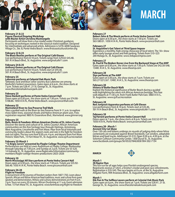 February 25-March 1“ 12 Angry Jurors” presented by Flagler College Theatre Department Performances are held at Lewis Auditorium at Flagler College, Wednesday through Saturday at 7:30 p. m. and Sunday at 2 p. m. Tickets are $ 5- $ 20. 14 Granada St., St. Augustine. www. flagler. edu / information / communitymembers / flagler-college-theatre-productions-2025-2026
