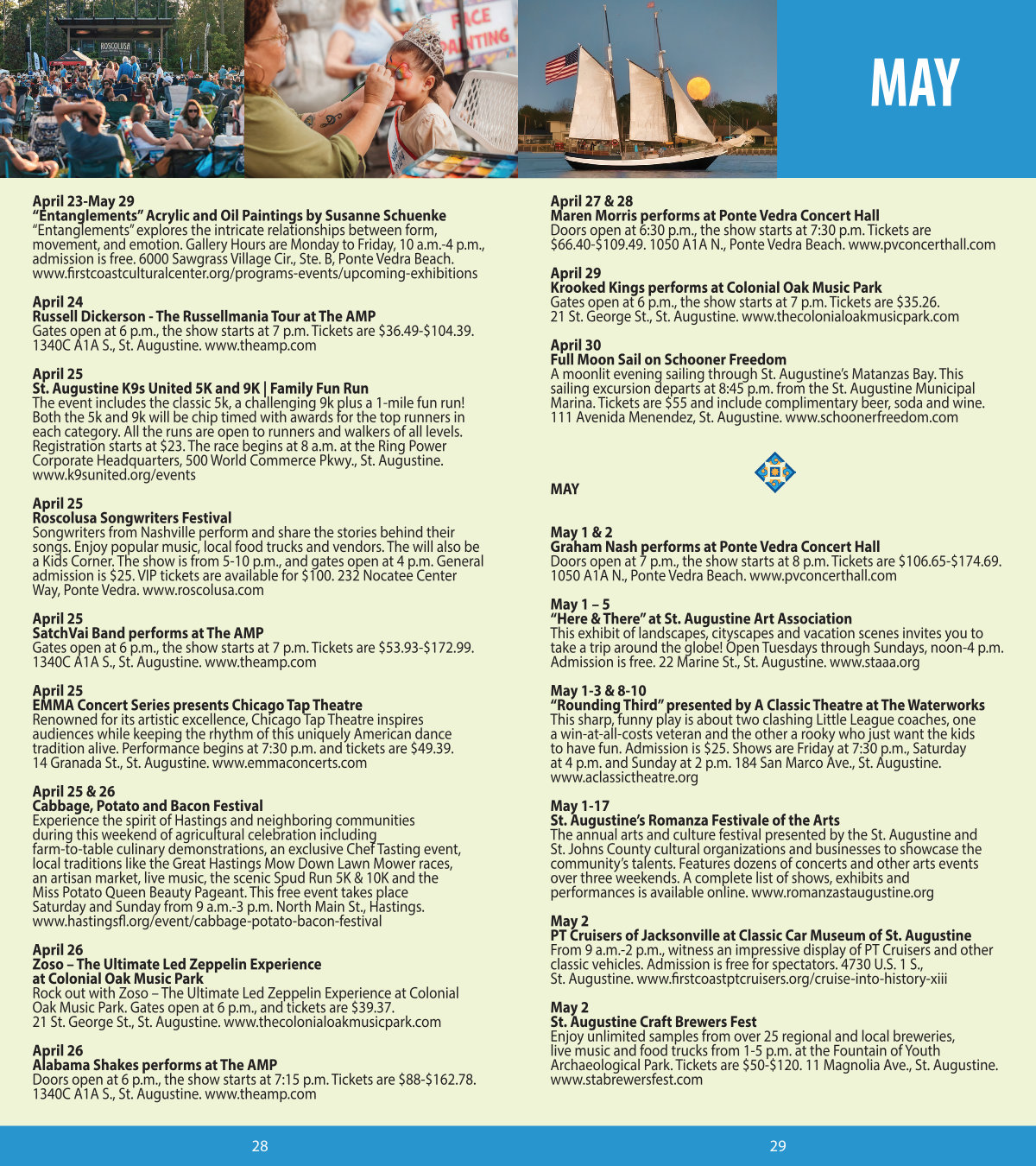 May 1-17 St. Augustine’ s Romanza Festivale of the Arts The annual arts and culture festival presented by the St. Augustine and St. Johns County cultural organizations and businesses to showcase the community’ s talents. Features dozens of concerts and other arts events over three weekends. A complete list of shows, exhibits and performances is available online. www. romanzastaugustine. org