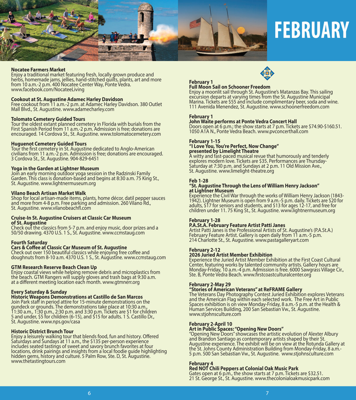 Historic District Brunch Tour Enjoy a leisurely walking tour that blends food, fun and history. Offered Saturdays and Sundays at 11 a. m., the $ 135 per-person experience includes seated tastings of sweet and savory brunch favorites at four locations, drink pairings and insights from a local foodie guide highlighting hidden gems, history and culture. 5 Palm Row, Ste. D, St. Augustine. www. thetastingtours. com