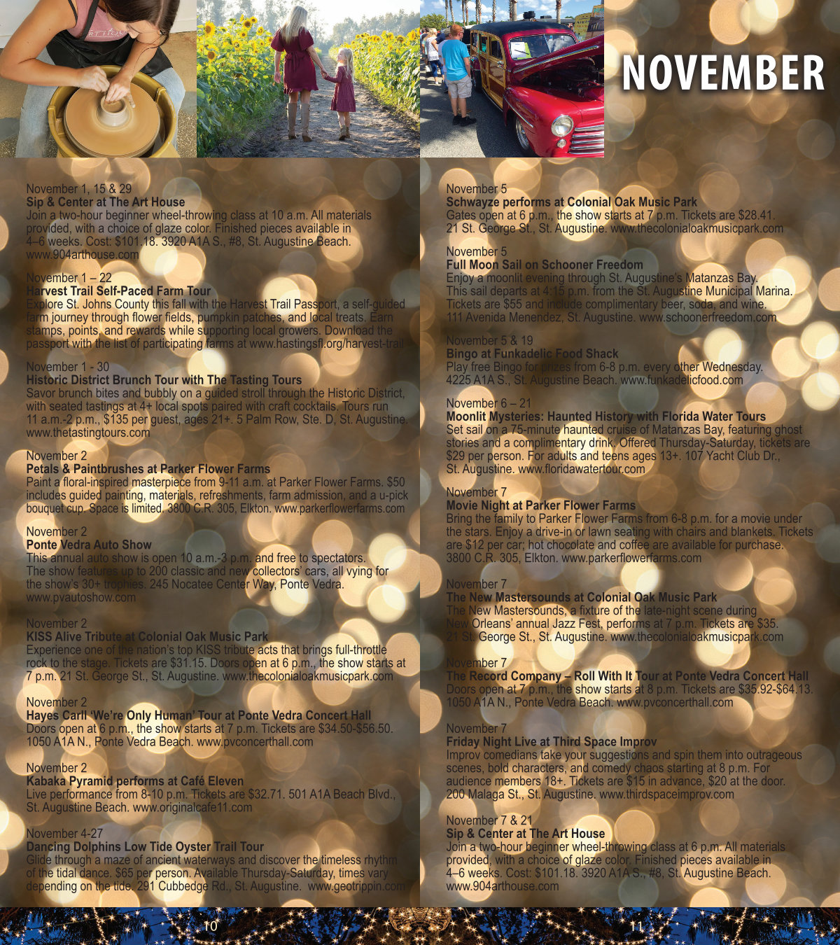November 1- 30 Historic District Brunch Tour with The Tasting Tours Savor brunch bites and bubbly on a guided stroll through the Historic District, with seated tastings at 4 + local spots paired with craft cocktails. Tours run 11 a. m.-2 p. m., $ 135 per guest, ages 21 +. 5 Palm Row, Ste. D, St. Augustine. www. thetastingtours. com