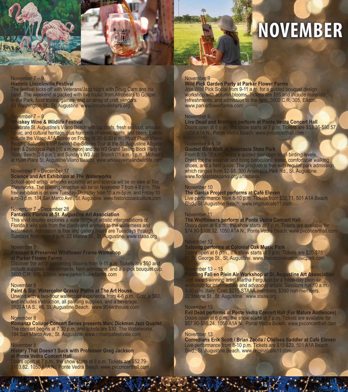 November 7 – 9 Historic Lincolnville Festival The festival kicks off with Veterans / Jazz Night with Doug Carn and his band. The weekend is packed with live music from Afrobeats to Gospel in the Park, food trucks, games, and an array of craft vendors. 83 Washington St., St. Augustine. www. lincolnvillehprs. org