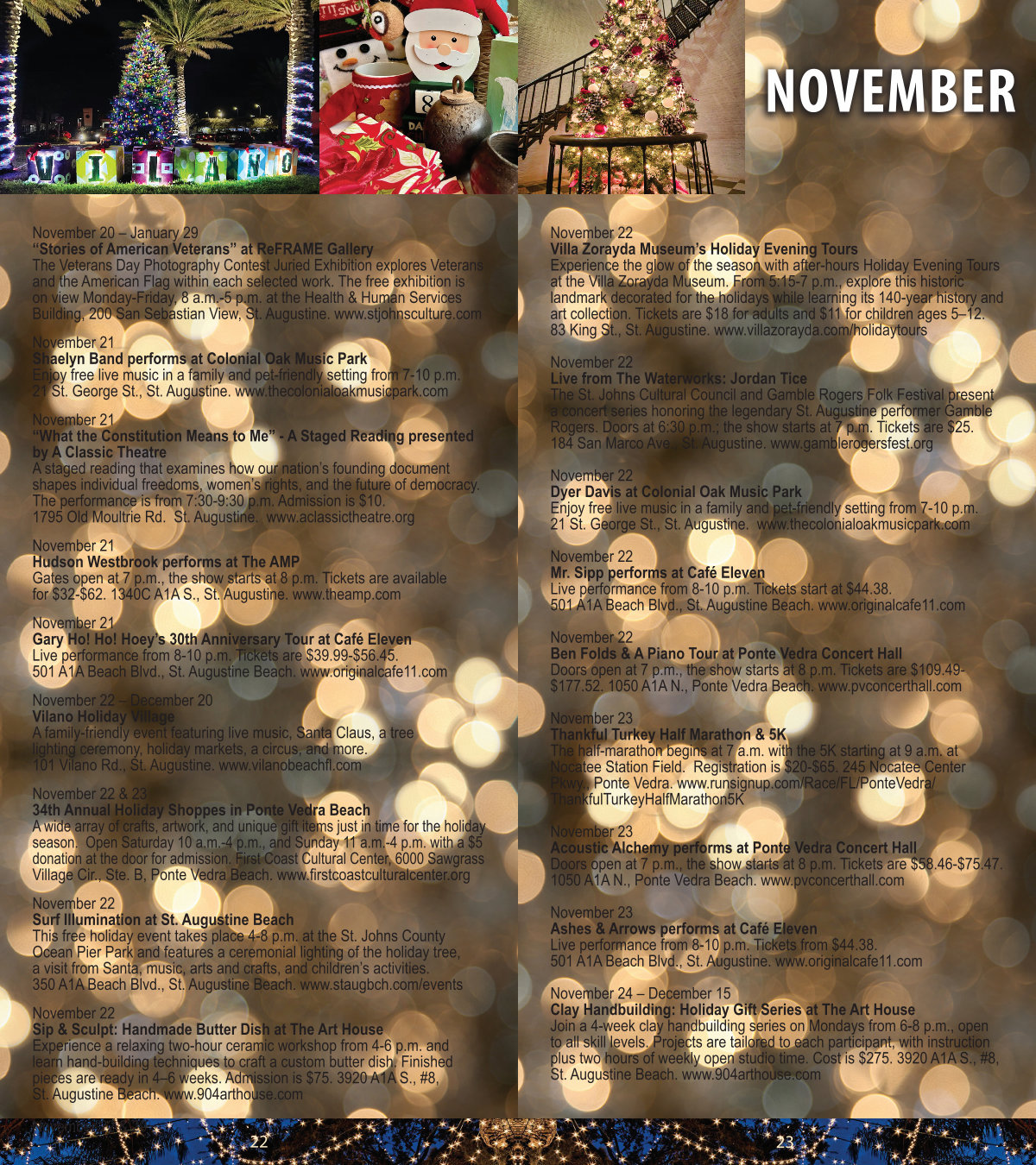 November 22 Villa Zorayda Museum’ s Holiday Evening Tours Experience the glow of the season with after-hours Holiday Evening Tours at the Villa Zorayda Museum. From 5:15-7 p. m., explore this historic landmark decorated for the holidays while learning its 140-year history and art collection. Tickets are $ 18 for adults and $ 11 for children ages 5 – 12. 83 King St., St. Augustine. www. villazorayda. com / holidaytours