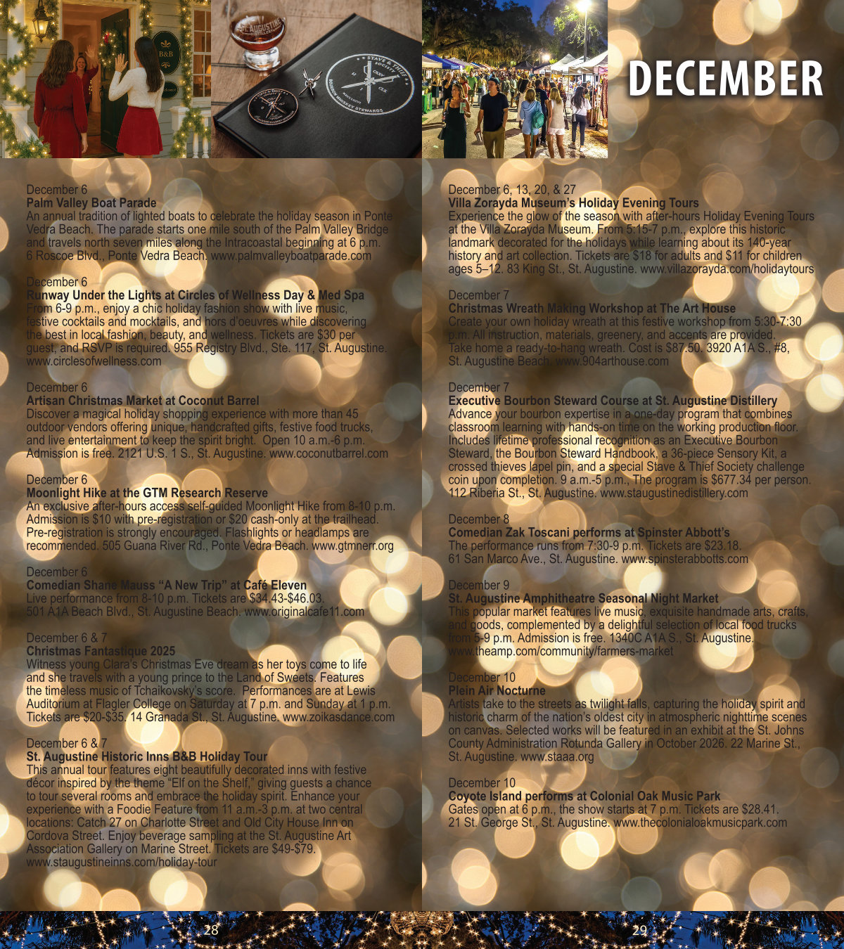 December 6 Runway Under the Lights at Circles of Wellness Day & Med Spa From 6-9 p. m., enjoy a chic holiday fashion show with live music, festive cocktails and mocktails, and hors d’ oeuvres while discovering the best in local fashion, beauty, and wellness. Tickets are $ 30 per guest, and RSVP is required. 955 Registry Blvd., Ste. 117, St. Augustine. www. circlesofwellness. com