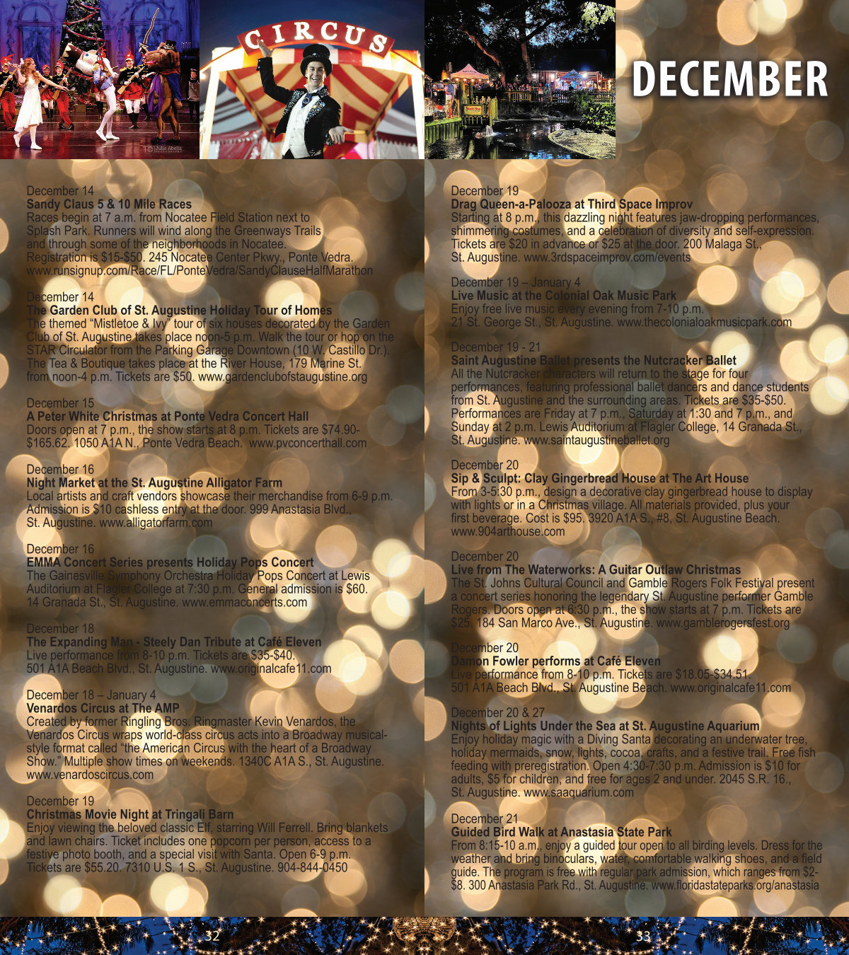 December 18 – January 4 Venardos Circus at The AMP Created by former Ringling Bros. Ringmaster Kevin Venardos, the Venardos Circus wraps world-class circus acts into a Broadway musicalstyle format called“ the American Circus with the heart of a Broadway Show.” Multiple show times on weekends. 1340C A1A S., St. Augustine. www. venardoscircus. com