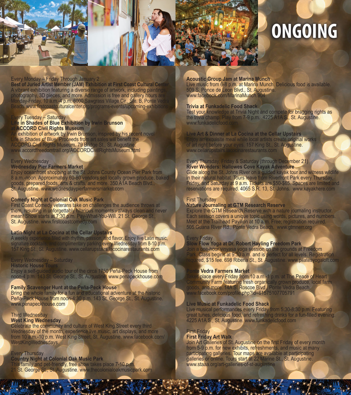 Every Monday – Friday Through January 2 Best of Juried Artist Member( JAM) Exhibition at First Coast Cultural Center A vibrant exhibition featuring a diverse range of artwork, including paintings, photography, 3D pieces, and more. Admission is free and gallery hours are Monday-Friday, 10 a. m.-4 p. m. 6000 Sawgrass Village Cir., Ste. B, Ponte Vedra Beach. www. firstcoastculturalcenter. org / programs-events / upcoming-exhibitions