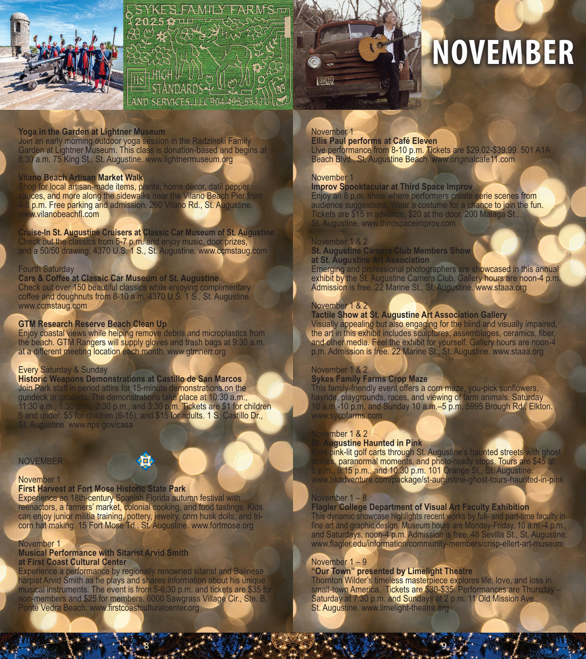 November 1 – 9“ Our Town” presented by Limelight Theatre Thornton Wilder’ s timeless masterpiece explores life, love, and loss in small-town America. Tickets are $ 30- $ 35. Performances are Thursday – Saturday at 7:30 p. m. and Sundays at 2 p. m. 11 Old Mission Ave., St. Augustine. www. limelight-theatre. org