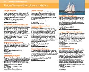 Located in the heart of the Historic District , the St . Augustine Art Association is recognized as the cultural epicenter of St . Augustine ’ s art community . New exhibitions are featured monthly , along with concerts , workshops , lectures , youth programs and a variety of art-related activities . With over 3,500 square feet of exhibition space , including four art galleries , the elegant Spanish-inspired venue has a grand piano , AV system , varied seating options and a tropical sculpture garden courtyard , the perfect setting for photos and outdoor gatherings . The unique space can accommodate large and small groups and offers a creative alternative for weddings , receptions , private parties , meetings , and other special events . Capacity : 125 22 Marine St ., St . Augustine , FL 32084 P : 904.824.2310 www . staaa . org