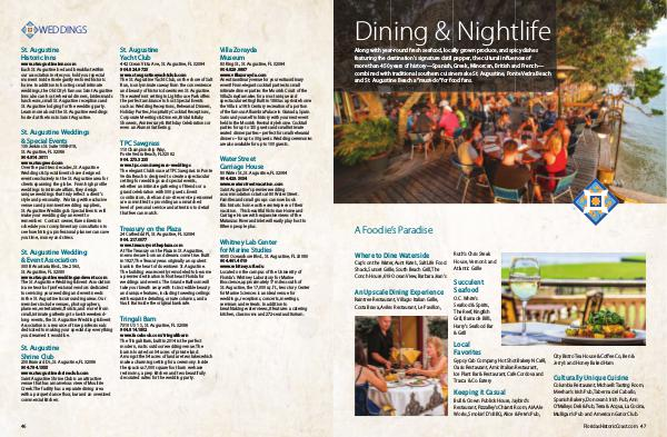 303 B Anastasia Blvd., Ste. 2563, St. Augustine, FL 32080 www. staugustineweddingandevents. com The St. Augustine Wedding & Event Association is a network of professional vendors dedicated to servicing your wedding and event needs in the St. Augustine & surrounding areas. Our members include venues, photographers, planners, entertainers, florists, and more! From small, intimate gatherings to lavish weekendlong events, the St. Augustine Wedding & Event Association is a resource of true professionals dedicated to making your special day everything you dreamed it would be.