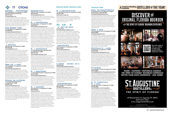 Ghost Tours of St. Augustine 4 Granada St., St. Augustine, FL 32084 904-825-0087 www. ghosttoursofstaugustine. com St. Augustine’ s original ghost tour company! They first began researching and documenting the city’ s haunted events more than 30 years ago and they are dedicated to preserving St. Augustine’ s true, authentic history. Nothing is exaggerated or made up for entertainment purposes and they limit their tour sizes for a more personalized experience. Tours offered include the famous A Ghostly Experience lantern-lit nightly walking tour, haunted pub crawls, paranormal investigations, private VIP tours and events and more.