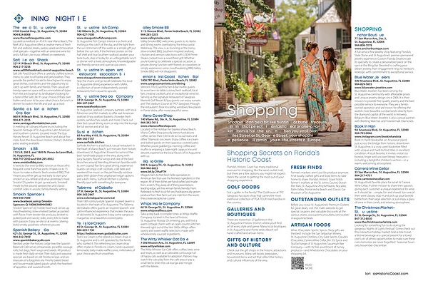 Santiago’ s Florida Kitchen & Craft Bar 860 A1A Beach Blvd., St. Augustine, FL 32080 904-471-2555 www. santiagosfloridakitchen. com A melding of culinary influences, including the Spanish heritage of St. Augustine, Latin American and Southern cuisines. Located inside The Guy Harvey Resort St. Augustine Beach and about five miles from the downtown Historic District. Outdoor patio seating available.