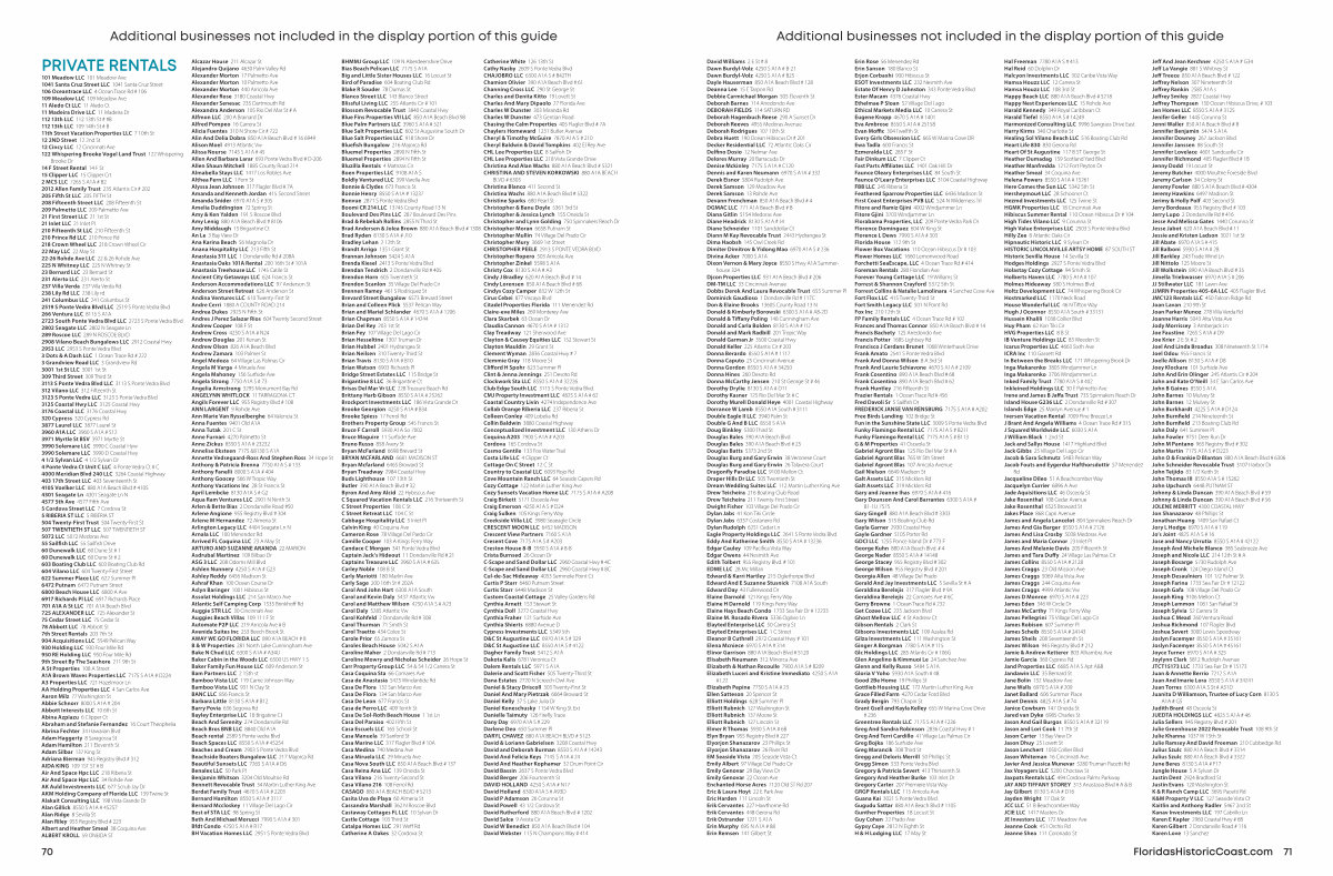 Erin Rose 56 Menendez Rd Erin Sanson 180 Blanco St Erjon Corbaxhi 900 Hibiscus St ESOT Investments LLC 232 Nesmith Ave Estate Of Henry D Johnston 343 Ponte Vedra Blvd Ester Macam 4376 Coastal Hwy Ethelmae P Sloan 52 Village Del Lago Ethical Markets Media LLC 10 Carrera St Eugene Kropp 4670 S A1A # 1401 Eva Ambrose 8550 S A1A # 25158 Evan Moffic 304 Twelfth St Every Girls Obsession LLC 665 W Marina Cove DR Ewa Tadla 600 Francis St Ezmeralda LLC 285 F St Fair Dinkum LLC 7 Clipper Ct Fast Parts Affiliates LLC 1401 Oak Hill Dr Faunce Oleary Enterprises LLC 84 South St Faunce O’ Leary Enterprises LLC 3104 Coastal Highway FBB LLC 245 Riberia St Feathered Sparrow Properties LLC 6436 Madison St First Coast Enterprises PVB LLC 524 N Wilderness Trl Fitore and Ramiz Gjini 4002 Windjammer Ln Fitore Gjini 3703 Windjammer Ln Florabama Properties, LLC 209 Ponte Vedra Park Dr Florence Dominguez 604 W King St Florence L Dews 7990 S A1A # 303 Florida House 112 9th St Flower Box Vacations 110 Ocean Hibiscus Dr # 103 Flower Homes LLC 1660 Lemonwood Road Forchetti SeaEscape, LLC 4 Ocean Trace Rd # 414 Foreman Rentals 280 Floridian Ave Forever Young Cottage LLC 19 Williams St Forrest & Shannon Crayford 5372 5th St Forrest Collins & Natalie Lamolinara 4 Sanchez Cove Ave Fort Flox LLC 415 Twenty-Third St Fort Smith Legacy LLC 501 N Point Rd Fox Inc 210 12th St FP Family Rentals LLC 4 Ocean Trace Rd # 102 Frances and Thomas Connor 850 A1A Beach Blvd # 14 Francis Bachety 125 Arredondo Ave Francis Potter 1685 Lightsey Rd Francisco J Cerdans Brunet 1068 Winterhawk Drive Frank Amato 2541 S Ponte Vedra Blvd Frank And Donna Wilson 8 A 3rd St Frank And Laurie Schiavone 4670 S A1A # 2109 Frank Cosentino 890 A1A Beach Blvd # 68 Frank Cosentino 890 A1A Beach Blvd # 62 Frank Huntley 216 Fifteenth St Frazier Rentals 1 Ocean Trace Rd # 456 Fred Davoli Sr 5 Sailfish Dr FREDERICK JANSE VAN RENSBURG 7175 S A1A # A202 Free Birds Landing 102 Bridge St Fun in the Sunshine State LLC 3009 S Ponte Vedra Blvd Funky Flamingo Rental LLC 7175 A1A S # B211 Funky Flamingo Rental LLC 7175 A1A S # B113 G & M Properties 41 Osceola St Gabriel Agront Blas 125 Rio Del Mar St # A Gabriel Agront Blas 765 W 5th Street Gabriel Agront Blas 107 Arricola Avenue Gail Nielson 6649 Madison St Galt Assets LLC 315 Micklers Rd Galt Assets LLC 319 Micklers Rd Gary and Joanne Ihas 6970 S A1A # 416 Gary Dounson And Carol Barrantes 6300 S A1A #