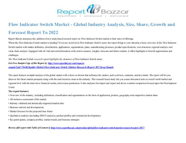 Browse full report with Table of Content @ http://www.reportbazzar.com/product/global-flow-indicator-switch-market-research-report-2017/