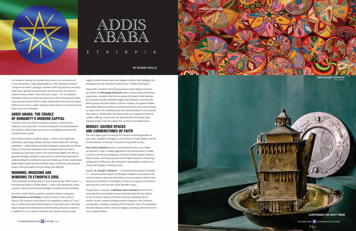 For travelers looking for authenticity, history, and adventure all in one destination, Addis Ababa delivers. With Ethiopian Airlines’“ Stopover at Addis” package, travelers with long layovers can enjoy hotel stays, ground transportation, and the chance to explore a cultural treasure that’ s more than just a stop— it’ s a revelation. Ethiopian Airlines provides nonstop service from Washington Dulles International Airport( IAD) to Addis Ababa Bole International Airport( ADD) seven times a week, making it easier than ever to discover the heart and soul of Ethiopia.