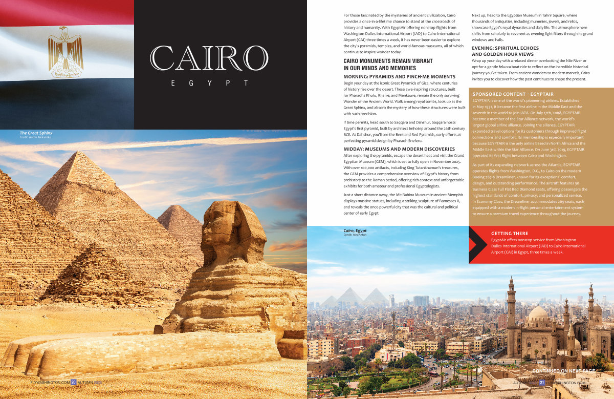 For those fascinated by the mysteries of ancient civilization, Cairo provides a once-in-a-lifetime chance to stand at the crossroads of history and humanity. With EgyptAir offering nonstop flights from Washington Dulles International Airport( IAD) to Cairo International Airport( CAI) three times a week, it has never been easier to explore the city’ s pyramids, temples, and world-famous museums, all of which continue to inspire wonder today.