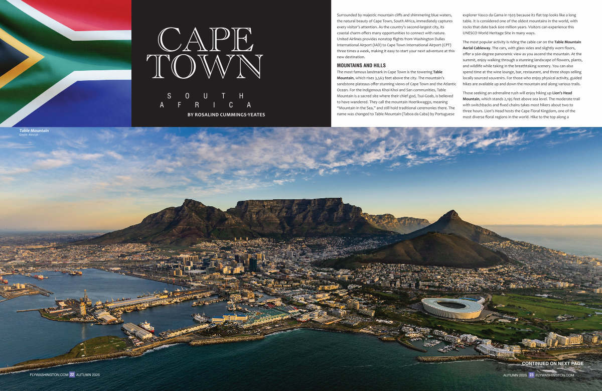 Surrounded by majestic mountain cliffs and shimmering blue waters, the natural beauty of Cape Town, South Africa, immediately captures every visitor’ s attention. As the country’ s second-largest city, its coastal charm offers many opportunities to connect with nature. United Airlines provides nonstop flights from Washington Dulles International Airport( IAD) to Cape Town International Airport( CPT) three times a week, making it easy to start your next adventure at this new destination.