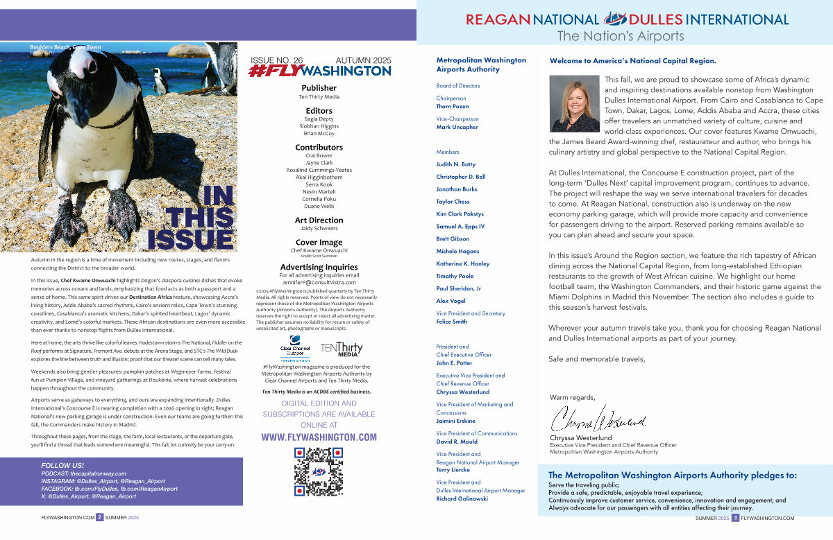 © 2025 # FlyWashington is published quarterly by Ten Thirty Media. All rights reserved. Points of view do not necessarily represent those of the Metropolitan Washington Airports Authority( Airports Authority). The Airports Authority reserves the right to accept or reject all advertising matter. The publisher assumes no liability for return or safety of unsolicited art, photographs or manuscripts.