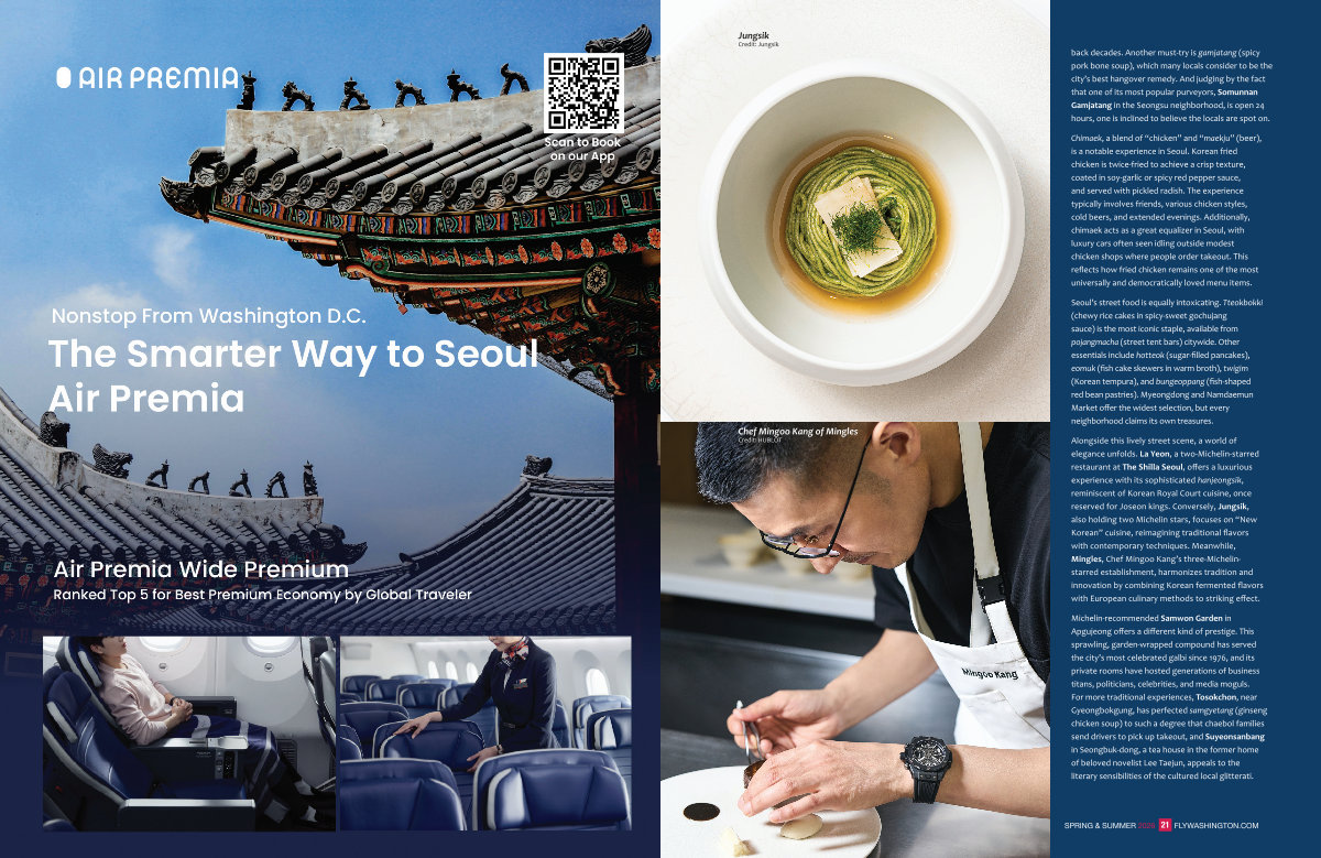 Alongside this lively street scene, a world of elegance unfolds. La Yeon, a two-Michelin-starred restaurant at The Shilla Seoul, offers a luxurious experience with its sophisticated hanjeongsik, reminiscent of Korean Royal Court cuisine, once reserved for Joseon kings. Conversely, Jungsik, also holding two Michelin stars, focuses on“ New Korean” cuisine, reimagining traditional flavors with contemporary techniques. Meanwhile, Mingles, Chef Mingoo Kang’ s three-Michelinstarred establishment, harmonizes tradition and innovation by combining Korean fermented flavors with European culinary methods to striking effect.