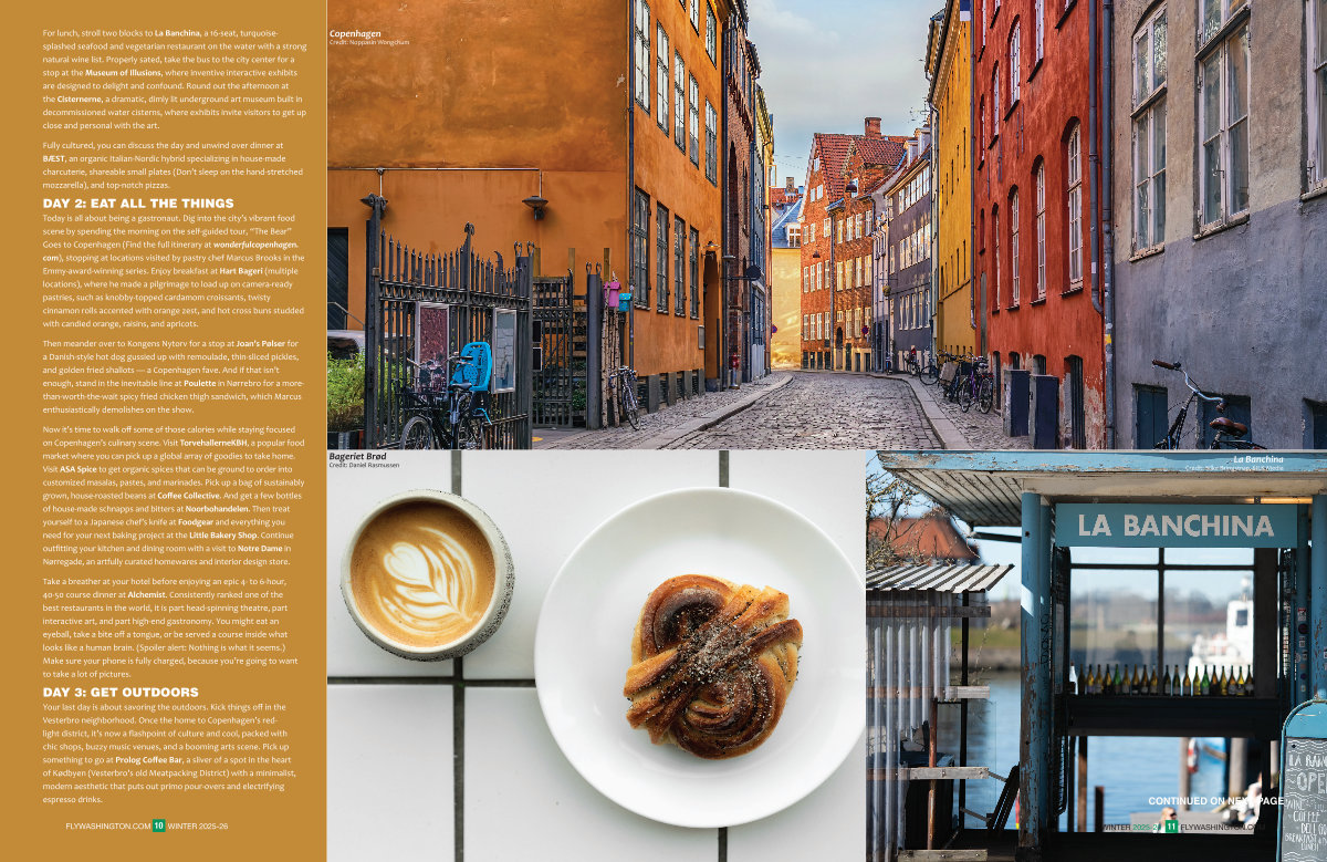 Today is all about being a gastronaut. Dig into the city’ s vibrant food scene by spending the morning on the self-guided tour,“ The Bear” Goes to Copenhagen( Find the full itinerary at wonderfulcopenhagen. com), stopping at locations visited by pastry chef Marcus Brooks in the Emmy-award-winning series. Enjoy breakfast at Hart Bageri( multiple locations), where he made a pilgrimage to load up on camera-ready pastries, such as knobby-topped cardamom croissants, twisty cinnamon rolls accented with orange zest, and hot cross buns studded with candied orange, raisins, and apricots.