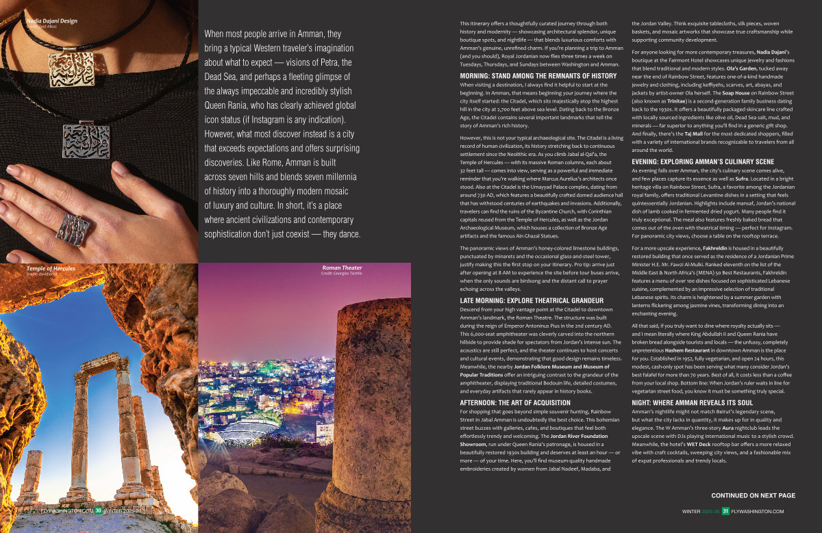 This itinerary offers a thoughtfully curated journey through both history and modernity— showcasing architectural splendor, unique boutique spots, and nightlife— that blends luxurious comforts with Amman’ s genuine, unrefined charm. If you’ re planning a trip to Amman( and you should), Royal Jordanian now flies three times a week on Tuesdays, Thursdays, and Sundays between Washington and Amman.