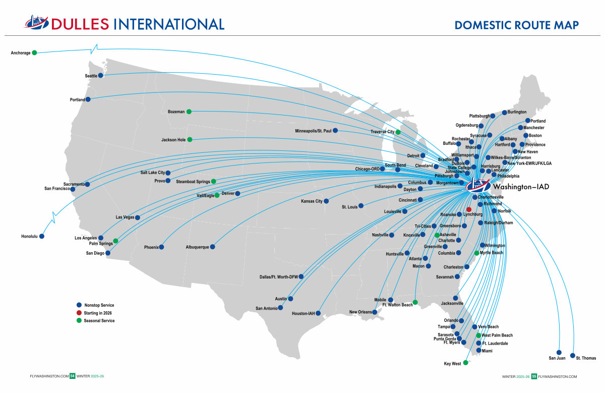 WINTER 2025-26 FLYWASHINGTON. COM 55 DOMESTIC ROUTE MAP St. Thomas Indianapolis on-IAH ansas City eapolis / St. Paul St. Louis Chicago-ORD New Orleans Nashville Louisville Columbia Charleston Savannah Tampa Miami Ft. Lauderdale Key West Sarasota Ft. Myers West Palm Beach Orlando San Juan Norfolk Columbus Cleveland Dayton Cincinnati Rochester Buffalo Albany Hartford Portland Boston Burlington Providence Punta Gorda Jacksonville Williamsport DuBois Mobile Knoxville Huntsville Charlotte New Haven Lancaster Philadelphia New York-EWR / JFK / LGA Wilkes-Barre / Scranton Traverse City State College Bradford South Bend Pittsburgh Ogdensburg Vero Beach Myrtle Beach Manchester Ft. Walton Beach Atlanta Macon Wilmington Harrisburg Plattsburgh Ithaca Syracuse Raleigh / Durham Richmond Charlottesville Greensboro Greenville Asheville Johnstown Detroit Morgantown Tri-Cities Roanoke Lynchburg Washington – IAD