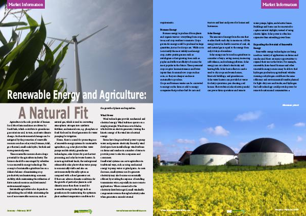 Renewable energy technologies are being used in a variety of applications on farms and ranches and there are many opportunities to expand their use in the future. For example, renewable, farm-based biomass and other renewable energy sources may be able to fuel hydrogen production; agricultural vehicles running on hydrogen could have the same efficiency and environmental bene ts planned for light-duty cars and trucks; and hydrogen fuel cell technology could provide power for remote locations and communities.
