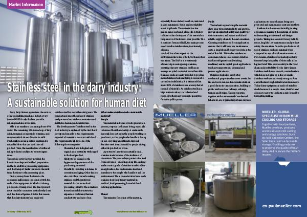 On its journey from the farm to the consumer, milk comes into contact with the walls of the equipment in which it is being processed or transported. �e nal product must reach the consumer meticulously clean and free from all germs. It is for this reason that the dairy industry has employed stainless steel for more than sixty years. �e compact and smooth surface of stainless steel prevents bacterial contamination and facilitates cleaning and disinfection.