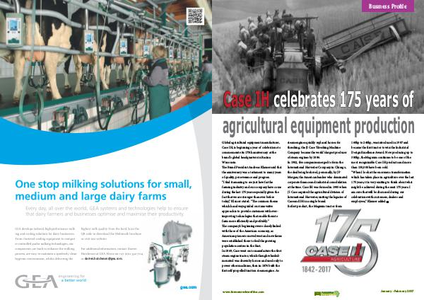 Global agricultural equipment manufacturer, Case IH, is beginning a year of celebrations to commemorate its 175th anniversary at the brand ' s global headquarters in Racine, Wisconsin �e Brand President Andreas Klauser said that the anniversary was a testament to many years of quality, perseverance and progress.“ I nd it amazing to see just how far the farming industry and our company have come during the last 175 years especially given the fact that we are stronger than ever before today,” Klauser stated.“ �e common theme which has always guided our innovative approach is to provide customers with everimproving technologies that enable them to farm more efficiently and pro tably.” �e company ' s beginnings were closely linked with those of the American economy, as American pioneers moved west and new farms were established there to feed the growing population centres in the East. In 1869, Case went on to manufacture the rst steam engine tractor, which though wheeledmounted was drawn by horses and used only to power other machines, then in 1876 built the rst self-propelled traction steam engine. As steam engines quickly replaced horses for threshing, the JI Case �reshing Machine Company became the world ' s largest producer of steam engines by 1886. In 1902, ve companies merged to form the International Harvester Company in Chicago, the deal being brokered, personally, by JP Morgan, the American banker who dominated corporate nance and industrial consolidation at the time. Case IH was formed in 1985 when J I Case acquired the agricultural division of International Harvester, uniting the legacies of Case and IH in a single brand. Its rst product, the Magnum tractor from