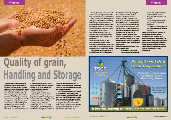 �e last cost to consider while storing your grain is quality deterioration. �is cost can be quite variable depending on the quality of the grain that was put into storage and how well the grain is managed. Problems may erupt from moisture, hot spots, insects, or even mold in the grain that was not detected. �ere are many pieces of technology available to monitor the grain quality and all elevators use these tools. For the best success in storing grain, here are recommendations: