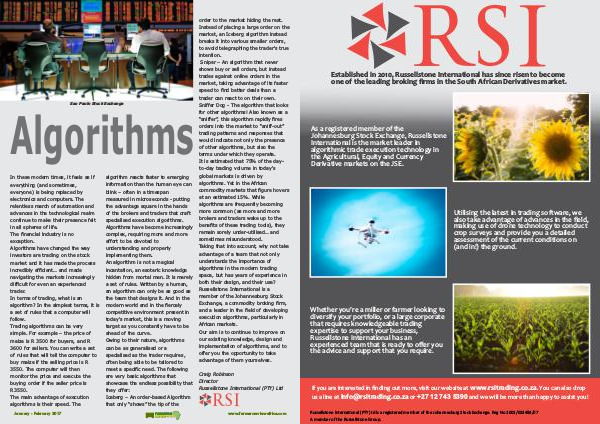 As a registered member of the Johannesburg Stock Exchange, Russellstone International is the market leader in algorithmic trade execution technology in the Agricultural, Equity and Currency Derivative markets on the JSE.