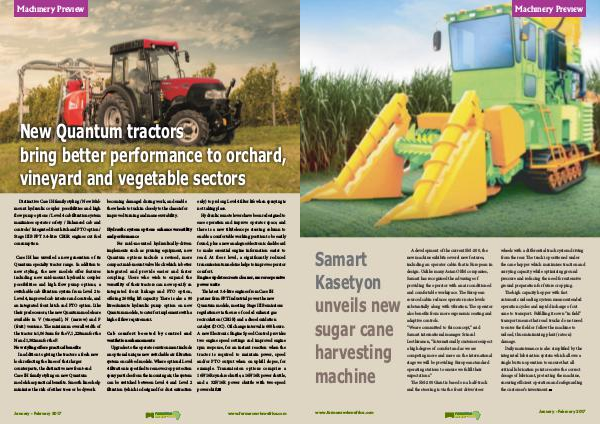 Case IH has unveiled a new generation of its Quantum specialty tractor range. In addition to new styling, the new models offer features including new mid-mount hydraulic coupler possibilities and high ow pump options, a switchable cab ltration system from Level 2 to Level 4, improved cab interior and controls, and an integrated front hitch and PTO option. Like their predecessors, the new Quantum models are available in V( vineyard), N( narrow) and F( fruit) versions. �e minimum overall width of the tractor is 1,063mm for the V, 1,228mm for the N and 1,382mm for the F. New styling offers practical bene ts