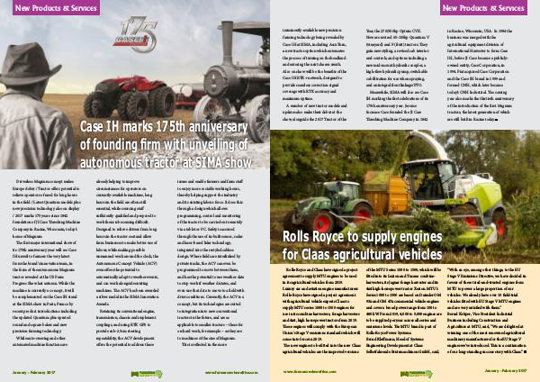 Rolls-Royce and Claas have signed a project agreement to supply MTU engines to be used in its agricultural vehicles from 2019. Luxury car and aviation engine manufacturers Rolls-Royce have signed a project agreement with agricultural vehicle experts Claas to supply MTU series 1000 to 1500 engines for use in its combine harvesters, forage harvesters and 4x4, high horsepower tractors from 2019. �ese engines will comply with the European Union ' s Stage V emissions standards which will come into force in 2019. �e new engines to be tted into the new Claas agricultural vehicles are the improved versions of the MTU Series 1000 to 1500, which will be tted into its Lexion and Tucano combineharvesters, its Jaguar forage harvester and its 4x4 high-horsepower tractor Xerion. MTU ' s Series 1000 to 1500 are based on Daimler OM 93x and OM 47x commercial vehicle engines and cover a broad power range from 100 to 480 kW. From 2019, 4,000 to 5,000 engines are to be supplied per year across all series and emissions levels. �e MTU brand is part of Rolls-Royce Power Systems. Bernd Kleffmann, Head of Systems Engineering Development at Claas Selbstfahrende Erntemaschinen GmbH, said,