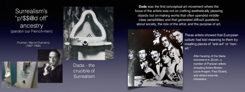 Surrealism’s “p!$$@d off” ancestry (pardon our French-men) Fountain, Marcel Duchamp (1887-1968) Dada - the crucible of Surrealism