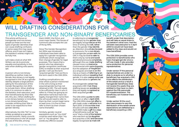 This article will focus on transgender and non-binary people as these are the two types of gender identities that can cause drafting confusion . In some cases this may cause offence , and if care isn ’ t taken the testator ’ s wishes might not be fully met .