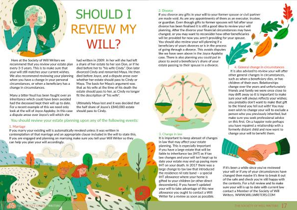 If it ’ s been a while since you ’ ve reviewed your will or if any of your circumstances have changed then maybe it ’ s time to break it out of the safe and check you ’ re still happy with the contents . For a full review and to make sure your will is up to date with current law contact a Member of the Society of Will Writers . WWW . WILLWRITERS . COM